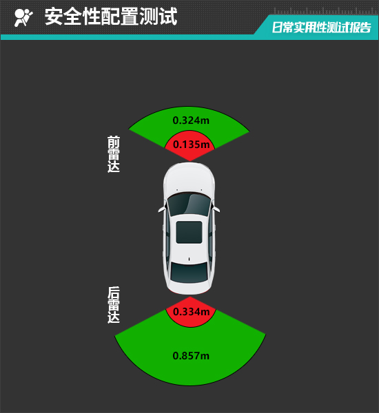前驻车雷达最远可在0.324m处感应到前方物体,雷达功率表现较差,最近端提示距离为0.135m,同样未达到同级别平均水平。