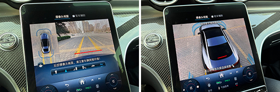 评测车配备了360度全景影像,实测摄像头成像质量较好,清晰度表现出色。同时,底部还可以切换车辆各个视角,确保车辆周边安全性。