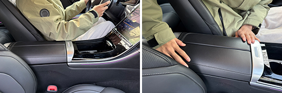评测车前排中央扶手箱采用对开式设计,面积宽大,虽然不支持位置调节,但在驾驶过程中还是能够对于驾驶者的手肘起到支撑作用。
