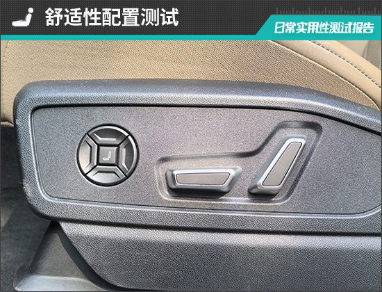 舒适性配置方面,评测车的前排座椅调节按键分别位于主/副驾座椅左右两侧,位置合理且操作便捷。功能方面,前排座椅选装了三档加热、三档通风和按摩功能,舒适性表现可圈可点。