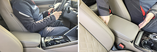 前排中央扶手箱采用上掀式设计,整体面积较大,并且采用软质材料包覆,触感舒适。实测中央扶手箱盖板支持角度调节,在正常驾驶坐姿下,能够为驾驶员的手肘提供有效支撑。