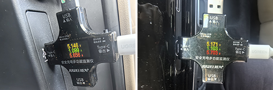 同时,我们对USB接口的电压、电流和功率进行了测试。前排USB Type-C接口充电功率5.656W,电压5.146V、电流1.099A。后排USB Type-C接口充电功率5.703W,电压5.171V、电流1.103A。