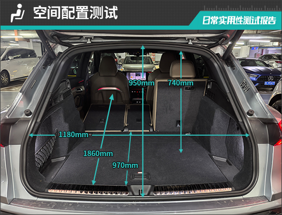 后备厢内部造型规整,两侧提供了独立的储物格,并带有置物网兜。后排座椅支持比例放倒,放倒后可以进一步拓展后备厢空间。对于评测车后备厢的基础数值,我们也进行了实测,开口长度为950mm;开口宽度为1180mm;后备厢进深为970-1860mm;后备厢地台与顶部的垂直高度为740mm。