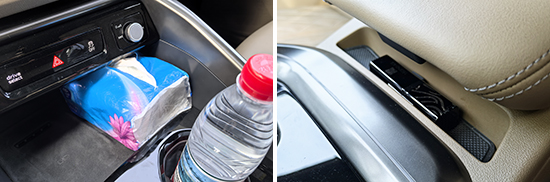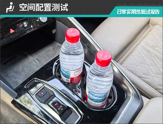 对于车内使用空间的测试,只针对前排触手可及的空间,不包括手套箱、中央扶手箱等需开启的空间。测试方法是将以下固定物品全部放置在前排的各个储物空间内,通过固定物品的放置情况来判断车辆储物空间的表现。测试选定的固定物品为:2瓶常规大小的矿泉水、1部大屏手机、1支口红、1个挎包、1副墨镜、1把折叠雨伞以及1包常规尺寸的抽纸。