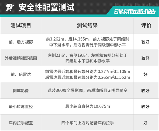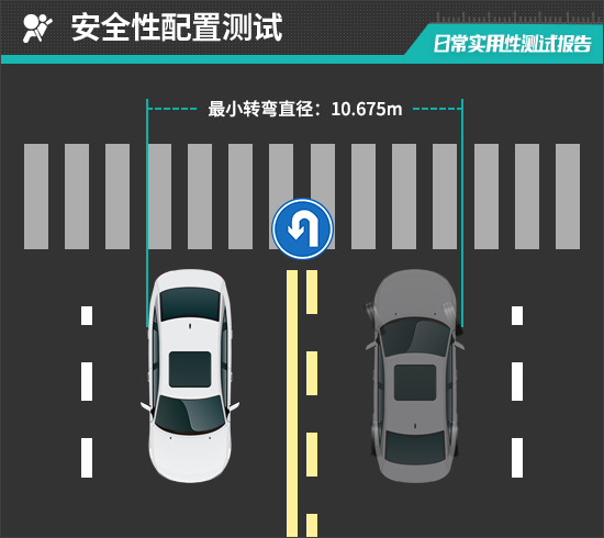 车辆在日常使用中,经常会遇到转弯或者掉头的情况,这个时候车辆的转向灵活性就显得非常重要了。了解爱车的最小转弯直径,能做到心中有数,从而避免剐蹭等危险情况的发生。经过实测,评测车最小转弯直径为10.675m,成绩在测试过的同级别车型中处于中下游水平。