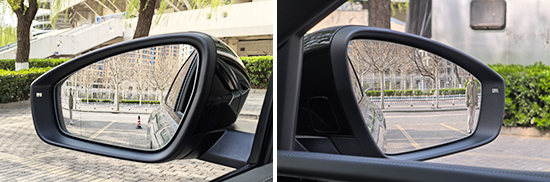 评测车的左侧外后视镜采用双曲率镜片,右侧外后视镜采用普通镜片,实测左外后视镜视野范围为21.6°,右外后视镜视野范围为19.8°,分别处于同级别中下游和中游水平。