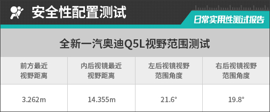 在车辆前、后方视野测试中,车内所有座椅均已调整至最低状态,所测出的数据与驾驶者正常使用时均有一些偏差,仅供参考。