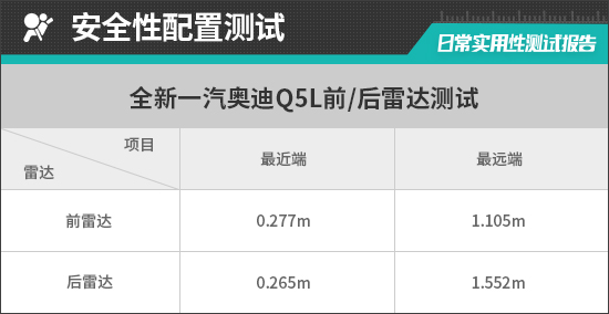 在测试过程中,后驻车雷达在1.552m处便可感应到后方物体,雷达功率表现不错。从实测数据来看,后驻车雷达最近端提示距离为0.265m,达到同级别车型平均水平。