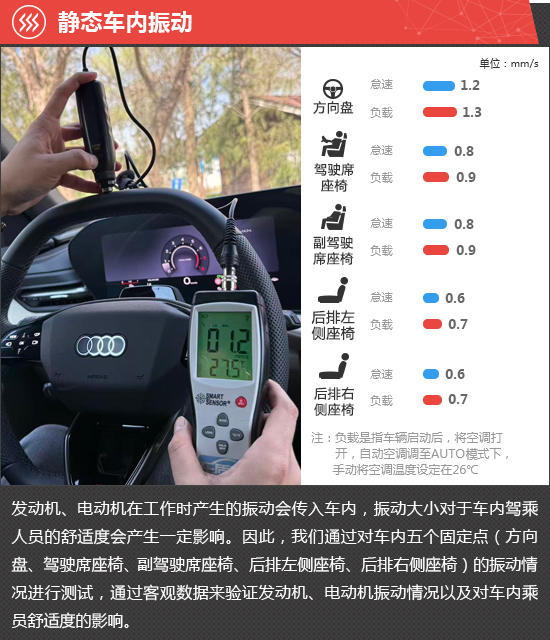 在静态车内振动测试环节,怠速状态下方向盘处的振动数值为1.2mm/s,负载状态下提升至1.3mm/s,振动感受明显。车内座椅的振动数值相对同级别车型均值偏高,前排和后排座椅怠速和负载状态的振动数值均相差0.1mm/s。