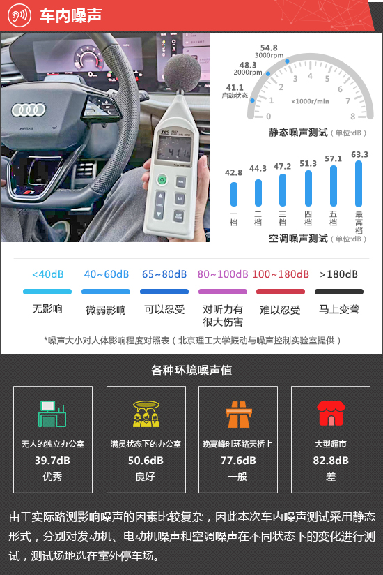 在静态噪声测试环节,全新一汽奥迪Q5L在启动状态下车内实测噪声值为41.1dB,在测试过的同级别车型中处于中下游水平。从测试数据来看,发动机在2000rpm和3000rpm时,传入车内的噪声值分别为48.3dB和54.8dB,整体表现处于同级别车型中游水平。