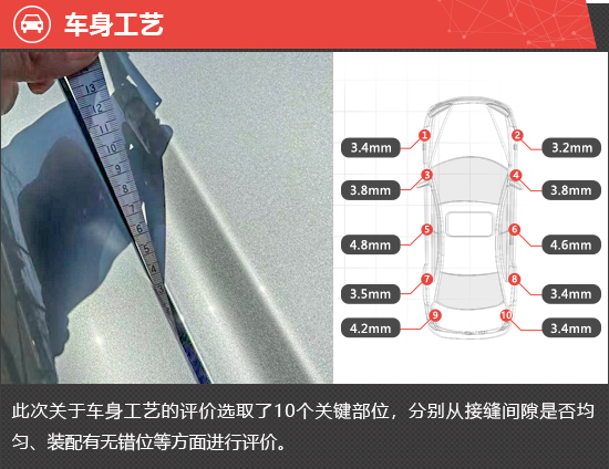 在车身工艺测试环节,整车共选取10个关键部位,每个关键部位都会选取3个关键点进行测量,以评价各关键部位缝隙的均匀程度。从测试结果来看,全车多数关键部位的缝隙均值控制合理,仅左右前车门至后车门连接处和左后翼子板至后备厢连接处的缝隙均值偏大,且后者左右两侧差值明显,车身工艺表现仍需提升。