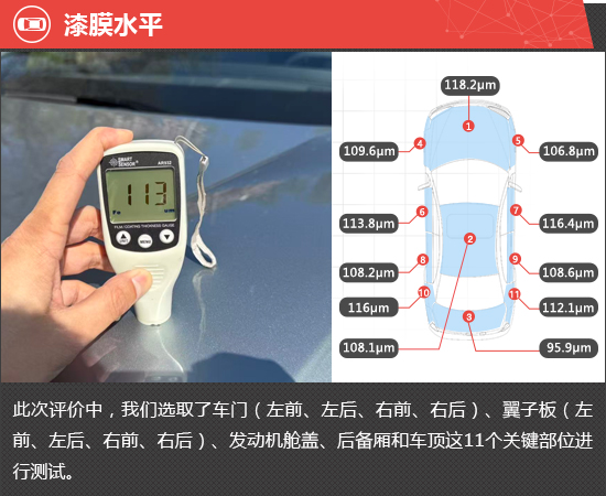 在漆膜水平测试环节,通过测试结果可以发现,整车漆膜平均厚度约为109.9μm,在测试过的同级别车型中处于中下游水平。从各关键部位的测试数据来看,多数关键部位的漆膜厚度值比较接近,仅后备厢处的数值明显偏低,可见漆膜喷涂均匀性还有提升空间。