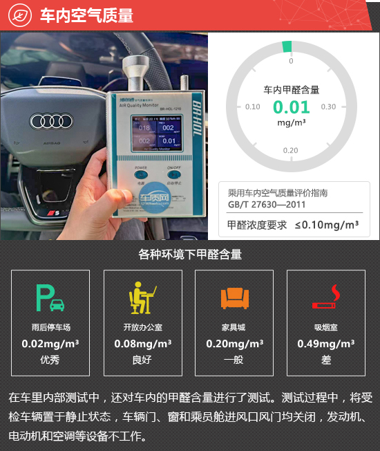 在车内空气质量测试环节,将车辆放置在车辆较少的内部地面停车场中,实测车内甲醛含量为0.01mg/m3,符合2012年3月1日起实施的,由原环保部和国家质量监督检验检疫总局联合发布的《乘用车内空气质量评价指南》(中华人民共和国国家标准GB/T 27630-2011)中的相关标准。