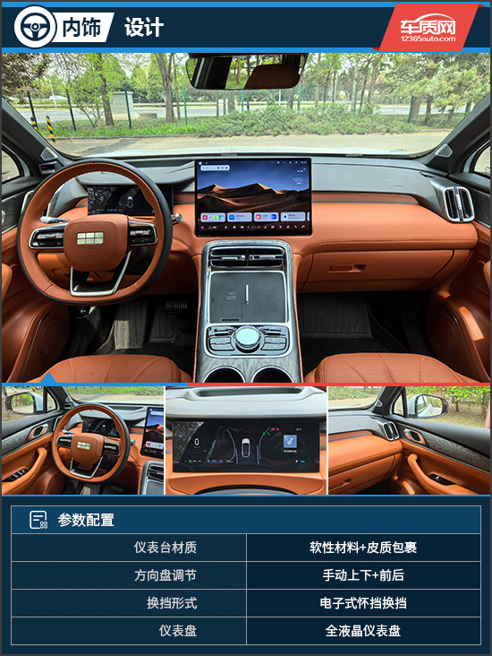 来到车内,评测车主打简约舒适的座舱理念,触手可及的地方多为软性材料和皮质包裹。三辐式方向盘采用皮质面料,手感细腻,中控台区域的水晶组件和生态木纹进一步提升了内饰的高级质感。