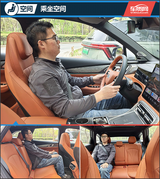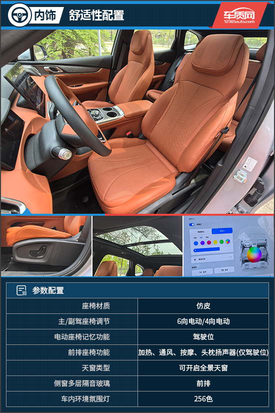 舒适性配置方面,评测车的棉花糖座椅采用十层复合结构打造,头枕和靠背为一体式造型,内部填充物柔软适中,侧向包裹也很充足。配合前排座椅加热、通风、按摩功能,能有效缓解长途乘车时的疲劳感。此外,评测车采用可开启全景天窗,打开顶部遮阳帘后可以提供明亮的车内环境;前排侧窗多层隔音玻璃和256色车内环境氛围灯的加入,可营造出相对静谧且具有沉浸感的座舱氛围。