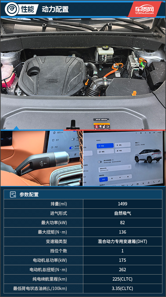 动力系统方面,评测车搭载由1.5L自然吸气发动机和单电机组成的插电式混合动力系统,发动机最大功率82kW、最大扭矩136N·m,电动机总功率175kW、总扭矩262N·m,匹配混合动力专用变速箱,CLTC纯电续航里程225km、综合续航里程1730km。