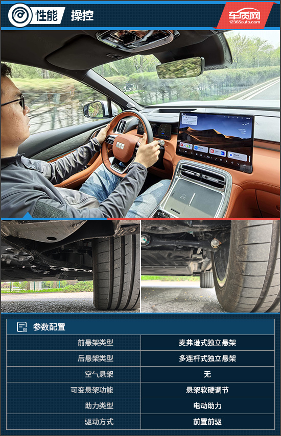 评测车采用前麦弗逊式独立悬架和后多连杆式独立悬架的组合。得益于AI虚拟底盘调校技术和阻尼自适应可变悬架,滤振效果表现出色,通过坑洼路段时能化解多余弹跳;高速过弯时车身侧倾控制良好,动能回收、转向助力可根据驾驶者自身习惯进行调节,操控乐趣十足。