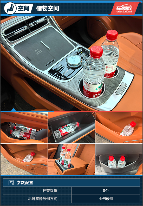 储物空间方面,评测车共有8个杯架,全车储物空间多达30处且布局合理。此外,中控台下方进行了掏空处理,方便放置随身物品;前排座椅后方的背袋容积可观,非常实用。