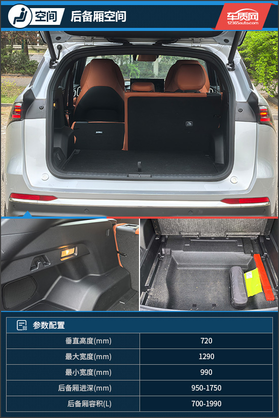 后备厢方面,评测车支持感应开启,内部布局规整,并提供有照明灯和挂钩。将后排座椅全部放倒后,容积可扩展至1990L,装载大件物品也游刃有余。另外,后备厢盖板下方还设有大容量隐藏储物空间,容积达到128L。