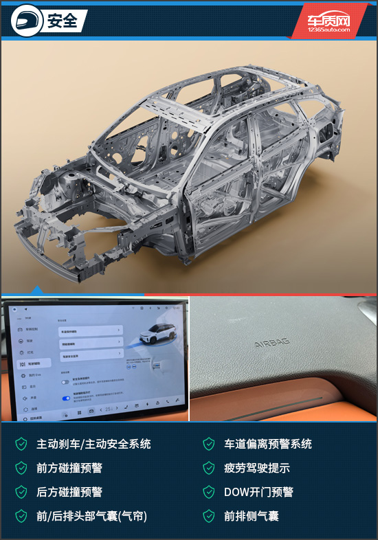 评测车采用九横四纵框架式保护结构。被动安全方面,像前/后排头部气囊(气帘)、前排侧气囊等均未缺席;主动安全方面,主动刹车/主动安全系统、车道偏离预警系统、前方碰撞预警等功能也一应俱全,时刻为用户出行安全提供全面保障。