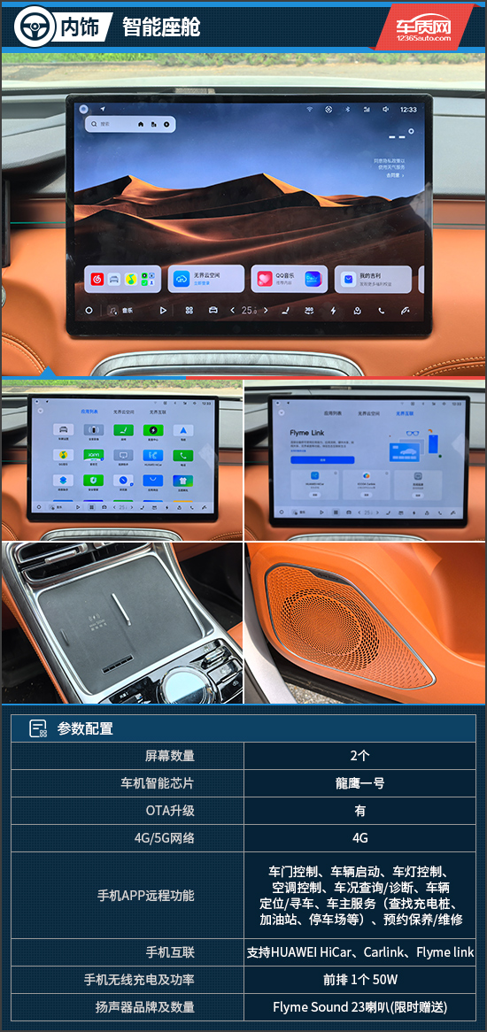 评测车的15.4英寸中控屏显示清晰,分辨率达到2.5K,配合10.2英寸全液晶仪表,驾驶者可直观、便捷地获取车辆信息。车机界面美观,操作流畅,支持HUAWEI HiCar、Carlink、Flyme link多种手机互联方式。Hi Eva语音车控在星睿大模型加持下,可实现快捷控车、全场景AI对话,让爱车变成懂你情绪的贴心伙伴。中控台位置提供了1个50W无线充电板,并带有通风散热口。同时,评测车限时赠送由23个扬声器组成的Flyme Sound音响系统,音质表现令人欣喜,娱乐体验十分出众。