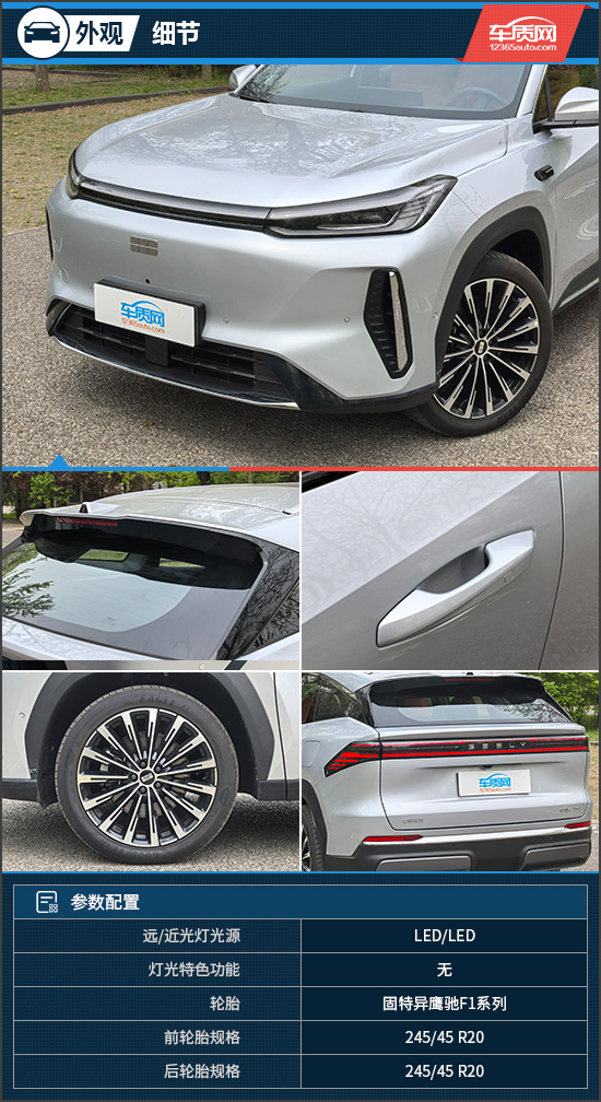 细节方面,评测车前部的星汉涟漪贯穿灯内部由362颗灯珠组成,点亮后辨识度拉满,科技感十分浓郁。车尾顶部还装配有小尺寸扰流板,将新潮格调瞬间拿捏。此外,20英寸多辐轮毂造型精致典雅,阳光照射下呈现出十足的金属质感。前/后轮胎规格均为245/45 R20,与之匹配的轮胎来自固特异鹰驰F1系列,是一款兼顾高性能、高安全性与舒适性的产品。