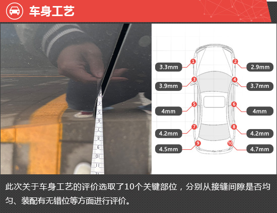 在车身工艺测试环节,整车共选取10个关键部位,每个关键部位都会选取3个关键点进行测量,以评价各关键部位缝隙的均匀程度。从测试结果来看,除右前翼子板与发动机舱盖之间缝隙均值偏小、后备厢与左右后翼子板之间的缝隙均值偏大外,其余关键部位的缝隙均值均处于正常范围,车身工艺表现仍有提升空间。