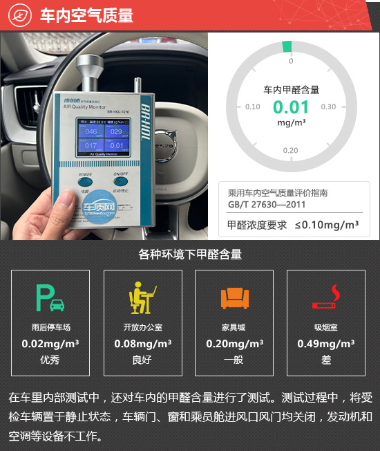 在车内空气质量测试环节,将车辆放置在车辆较少的内部地面停车场中,实测车内甲醛含量为0.01mg/m3,符合2012年3月1日起实施的,由原环保部和国家质量监督检验检疫总局联合发布的《乘用车内空气质量评价指南》(中华人民共和国国家标准GB/T 27630-2011)中的相关标准。