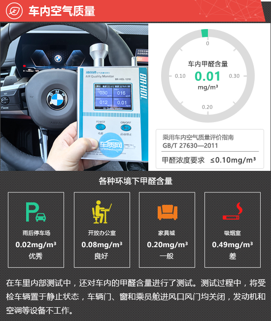 在车内空气质量测试环节,将车辆放置在车辆较少的内部地面停车场中,实测2026款华晨宝马X1的车内甲醛含量为0.01mg/m3,符合2012年3月1日起实施的,由原环保部和国家质量监督检验检疫总局联合发布的《乘用车内空气质量评价指南》(中华人民共和国国家标准GB/T 27630-2011)中的相关标准。