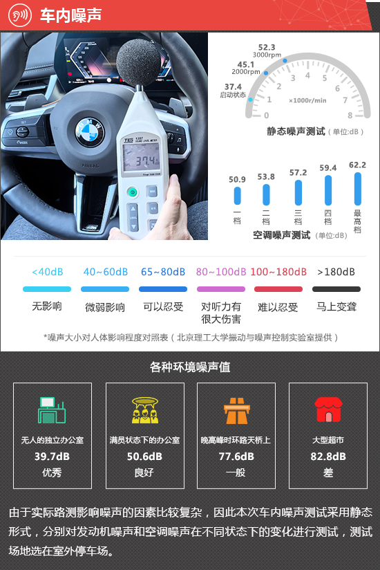 在静态噪声测试环节,2026款华晨宝马X1在启动状态下车内实测噪声值为37.4dB,在测试过的同级别车型中处于中游水平。从测试数据来看,发动机在2000rpm和3000rpm时,传入车内的噪声值分别为45.1dB和52.3dB,整体表现处于同级别车型中下游水平。