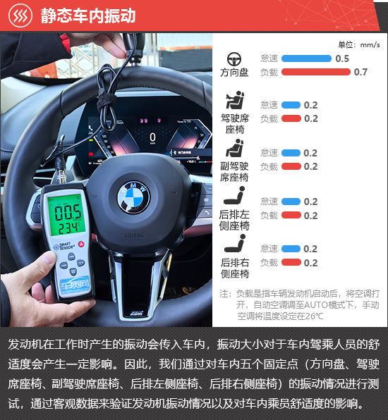 在静态车内振动测试环节,怠速状态下,2026款华晨宝马X1方向盘位置的振动数值略高于前后排座椅。负载状态下,方向盘的振动数值有所升高,而前后排座椅的振动数值则保持不变。