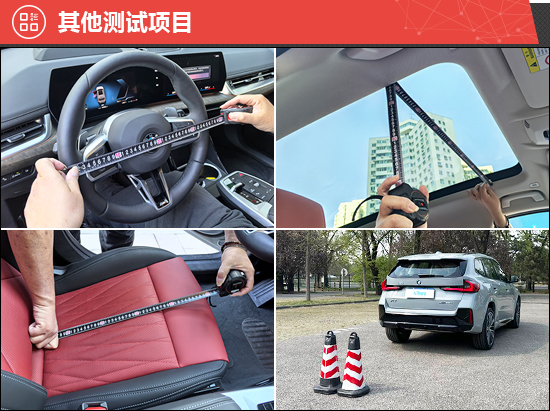 此外,我们还针对驻车雷达、灯光/视野、操控系统、轮胎、天窗、座椅、后备厢进行了测试。经过测试,2026款华晨宝马X1两侧外后视镜视野范围角度达到同级别车型中上游水平。评测车配备普利司通泰然者6轮胎,在静音性、舒适性及操控性等各方面均实现显著提升,轮胎规格为245/40 R20。相对而言,后排座椅座垫长度偏短,有待优化。
