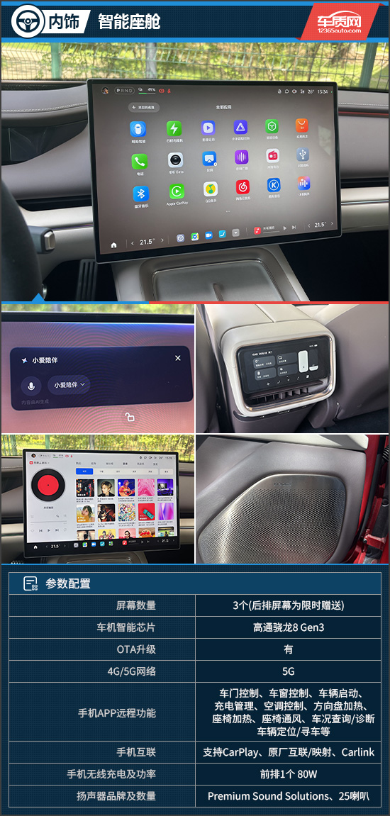 16.1英寸3K中控屏内置高通骁龙8 Gen3车机智能芯片,升级后的超级小爱覆盖95%车控功能,支持一句话多指令、模糊指令、创建小米超级任务等,常用操作开口即达。此外,通透模式可通过麦克风将车外声音传入车内,无需开窗即可完成交流,并可无级调节声量大小,细节考虑周到。同时,其还配备了带有25个顶级Premium Sound Solutions扬声器的音响系统,支持杜比全景声,可带来沉浸式听觉体验。