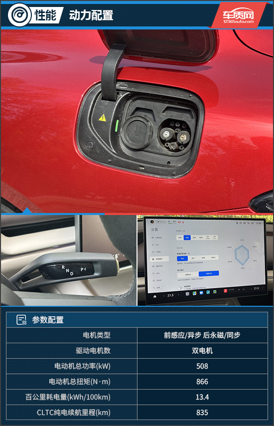 评测车基于897V高压平台打造,搭配前后双电机,电机总功率508kW,总扭矩866N·m,0-100km/h加速时间为3.08s,CLTC纯电续航里程835km。