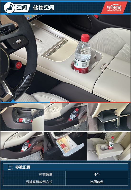 储物空间方面,中控台前方配备两个储物槽,左侧支持80W手机无线充电,后方为横向布局的双杯架以及中央扶手箱,下方还进行了掏空处理。稍显可惜的是,车门把手未采用封底设计,随身小件物品的收纳略有受限。