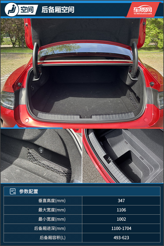 后备厢内部空间较为规整,常规状态下容积为493L,后排座椅放倒后可扩展至623L,便于收纳较长的物品。此外,内部配备网兜、12V电源等实用配置,并提供下沉式储物格,细节设计较为完善。