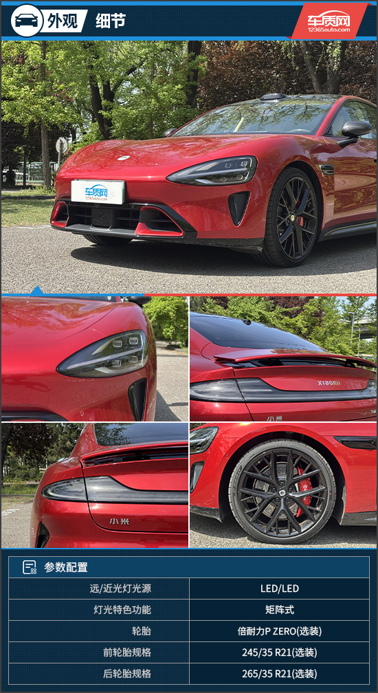 车身侧面姿态低趴战斗,外扩的轮拱带来了极度夸张的宽体效果,令其更具性能范儿。全新升级的半隐藏式门把手可实现机械开启,既有助于降低风阻系数,又保障了紧急状态下的安全冗余。车尾造型简洁立体,光环尾灯点亮后辨识度颇高,4档可调电动尾翼不仅帅气,还可智能平衡能效与操控。此外,评测车选装了21英寸运动轮毂配倍耐力P ZERO轮胎的组合,并使用前245/35 R21、后265/35 R21的规格,提供了极致的抓地性能。