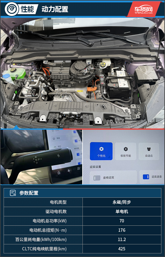 动力方面,评测车搭载了八合一电驱总成,相较传统方案重量减轻15%、体积缩减18%,功率密度提升10%。电动机总功率70kW、总扭矩176N·m,驱动车身游刃有余,CLTC工况纯电续航里程达到425km。补能表现同样可圈可点,将电量从30%充至80%的时长仅需16.9分钟,一杯咖啡的工夫便能蓄势待发,有效缓解里程焦虑。