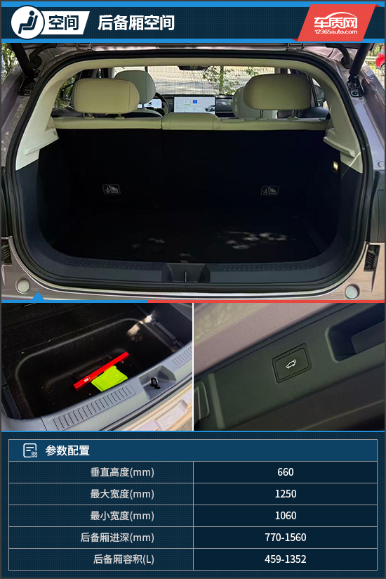 后备厢方面,尾门支持电动开闭并带有位置记忆功能,日常使用便利。内部空间规整,盖板下方设置了一处容积可观的隐藏式储物槽。常规状态下,后备厢容积为459L,将后排座椅全部放倒后,容积可进一步扩展至1352L,面对大件行李或搬家载物场景也能从容应对。
