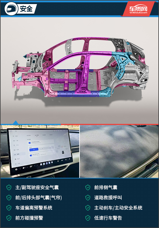 评测车采用高强度笼式车身设计,搭配6安全气囊,被动安全防护到位。同时,搭载的“极光电池”具备10层防护矩阵,实现电池包全方位安全保护。此外,该车还配备主动刹车/主动安全系统、车道偏离预警系统、前方碰撞预警等功能,时刻为出行安全提供保障。
