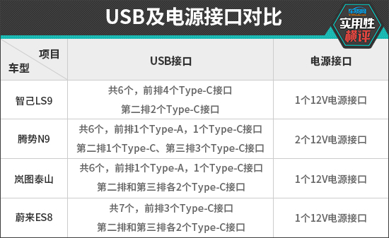 充电接口方面,蔚来ES8的数量最多,全车共计达到7个。相比之下,另外三款车型的USB接口数量均为6个。其中,只有腾势N9和岚图泰山的前排配备了Type-A和Type-C两种接口类型,兼容性较好。