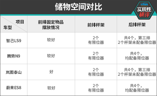 杯架测试中,四款车型均采用三排座椅布局,共计配备6个杯架。其中,智己LS9和岚图泰山第三排的2个杯架均未配备限位器,尚存在优化空间。