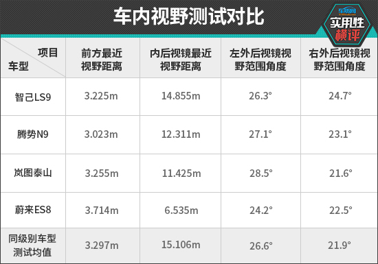在四款车型中,只有蔚来ES8的前方视野最近距离并未达到同级别平均水平。不过,得益于配备了流媒体后视镜,蔚来ES8内后视镜最近视野距离仅为6.535m,在测试过的同级别车型中处于上游水平。