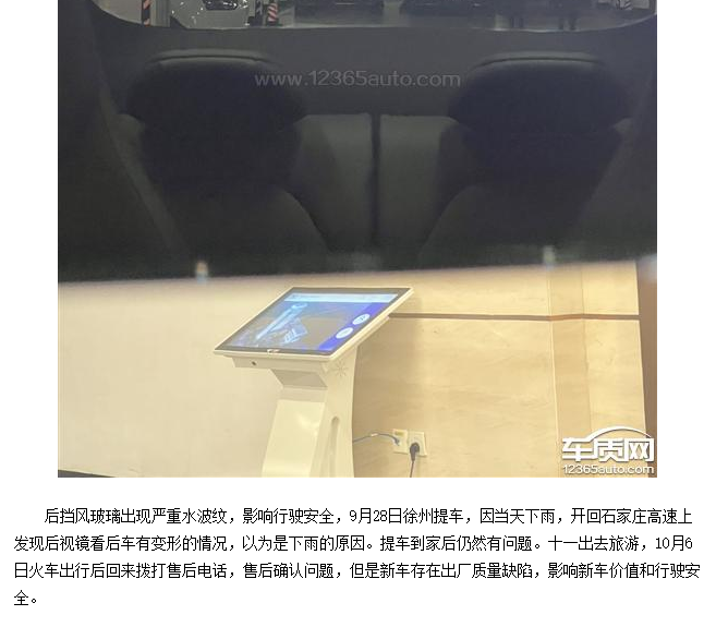 特斯拉Model Y L 前后挡风玻璃有水波纹,在上牌路上即发现通过车内后视镜观察后方车辆时,后挡风玻璃存在严重水波纹状视觉扭曲,导致后方物体变形,当即向交付中心反馈。然而,交付人员以“同款车也有此现象”及“售后检测无问题”为由,未予处理。初期接触时间短,我误以为或是正常情况。但在后续行驶中,该扭曲问题导致我观看后视镜时频繁产生眩晕感,已严重影响驾驶安全,至今不敢多看。我随后预约售后检修,对方经比对拍照后,仅以邮件回复称此为“双层夹胶工艺问题,属正常现象”于是我网上了解情况,我看这样的问题车质网上也有不少车友反馈,我希望厂家能够重视处理,而不是不管不问。