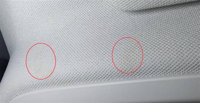 车顶棚出现黄色污点,特别难看。而且这个不是个例,车质网也有车友反馈这个问题了。