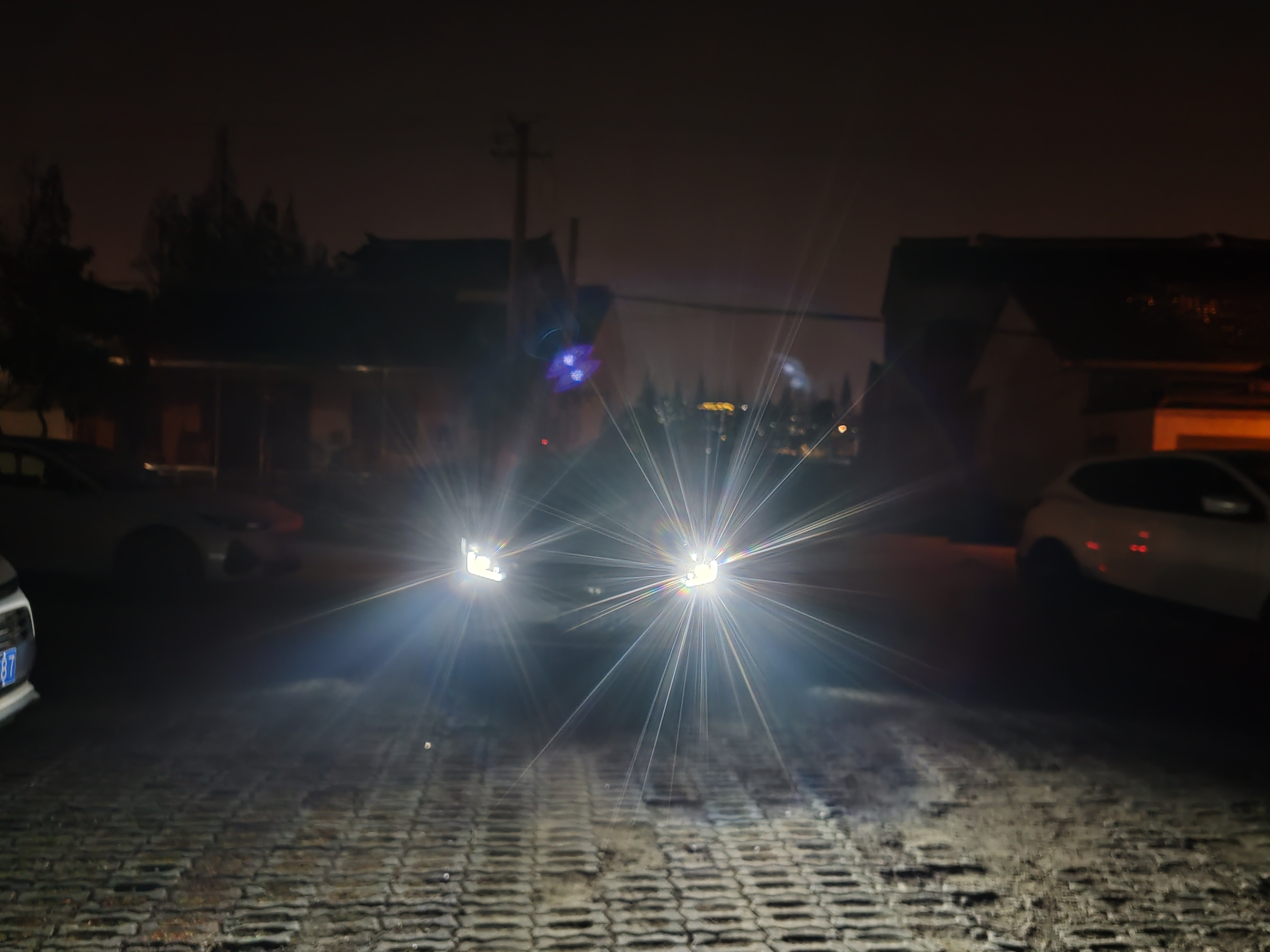 镜头下左边大灯有明显星芒效果,肉眼看有明显的“彩虹光圈”