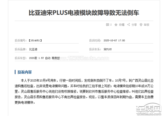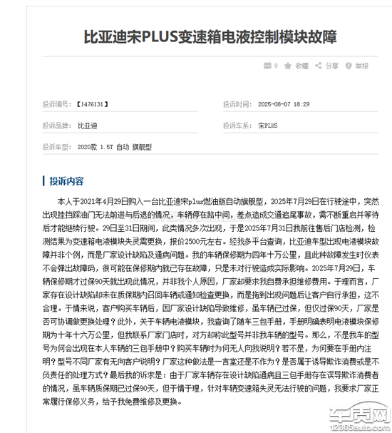 故障现象:25年10月中旬,出现D挡不走,需加油门,且挂入倒挡后车辆也不动,在跑高速时加油门空转转速表持续上升,速度一直往下掉,自适应巡航ACC介入也是无果一样没有速度速度一直往下降,25年12月去4s店检测,电液模块故障导致失速,由于超出三包拒保。诉求;更换电液模块,且三包服务中存在欺诈,三包服务中表明,6DT25双离合,6DT25电液控制模块非营运保修期是在10年或16万公里到店后4S店告知这个三包手册针对的变速箱不是比亚迪宋PLUS燃油车,那不是本车的,从而拒保。既然不是本车的变速箱型号为什么还单独进行列出从而误导消费者。相似案例;根据网络公布,比亚迪电液模块存在质量缺陷,很多车主在过保后出现相同症状。望贵司给我们个合理的解释。