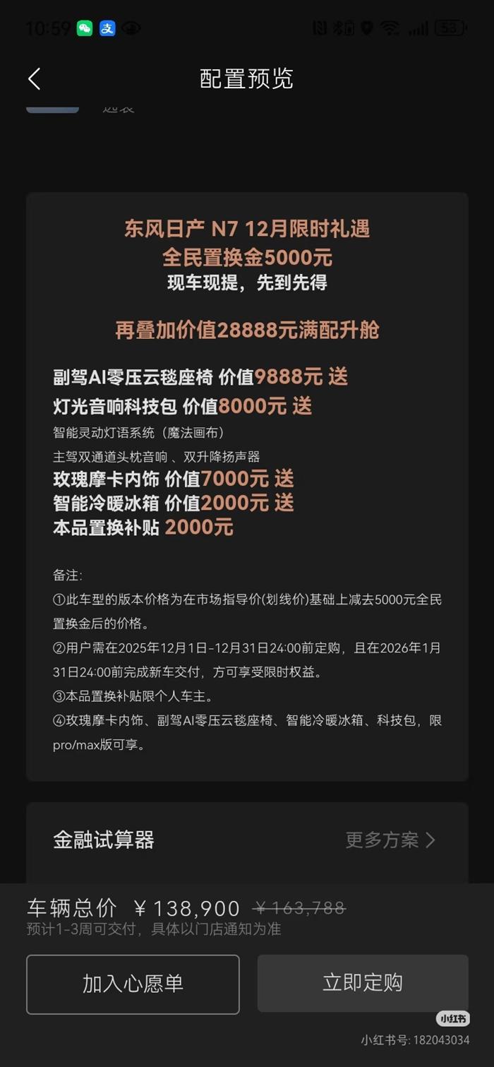 购入的是510max版本,5000选装科技包+冰箱一共多花1000元,10月中旬提车就2年免息背刺,2年8万免息,这8万两年存理财或者定期都有2000元了。然后11月开始又科技包冰箱免费,等于之前选装多花1000元,现在12月又有降价5000现金优惠,等于共计有6000元钱的背刺金额。11月中一直联系厂家处理无果,等来的不是厂家处理补偿而是12月对消费者的更加背刺。销售和厂家都说权益只会降不会增加,日产作为大品牌厂家毫无信誉可言,现在要求同等权益赔偿差价。