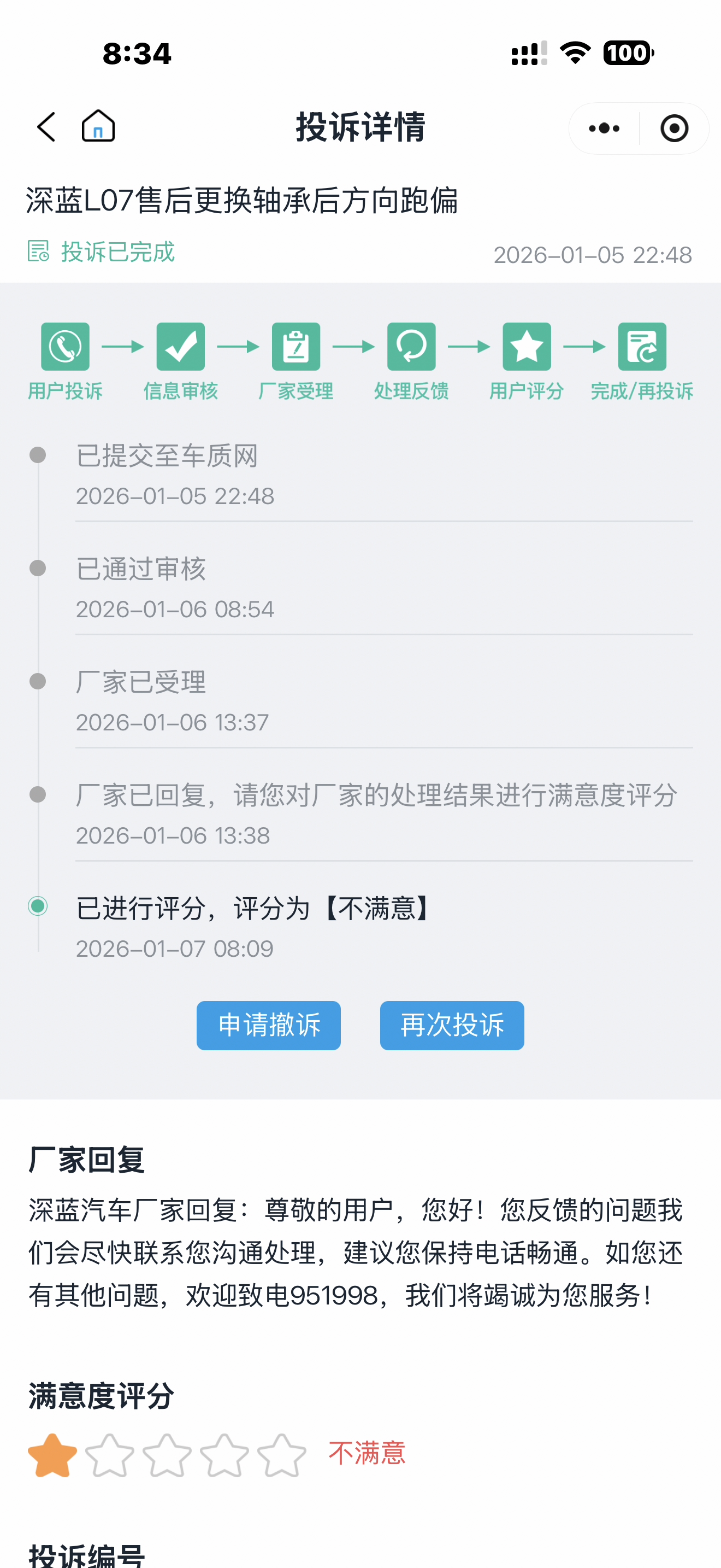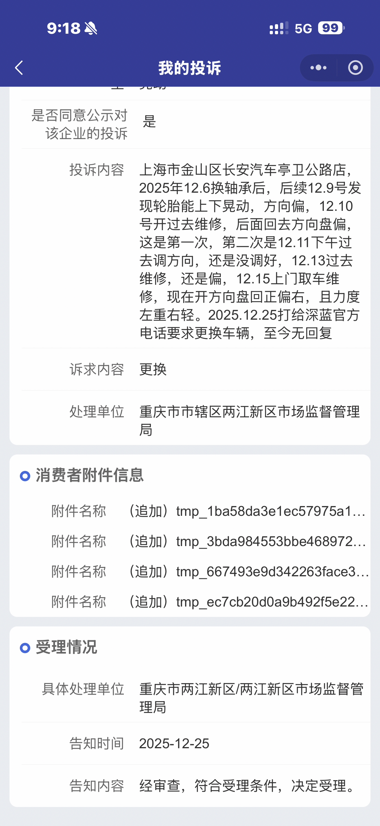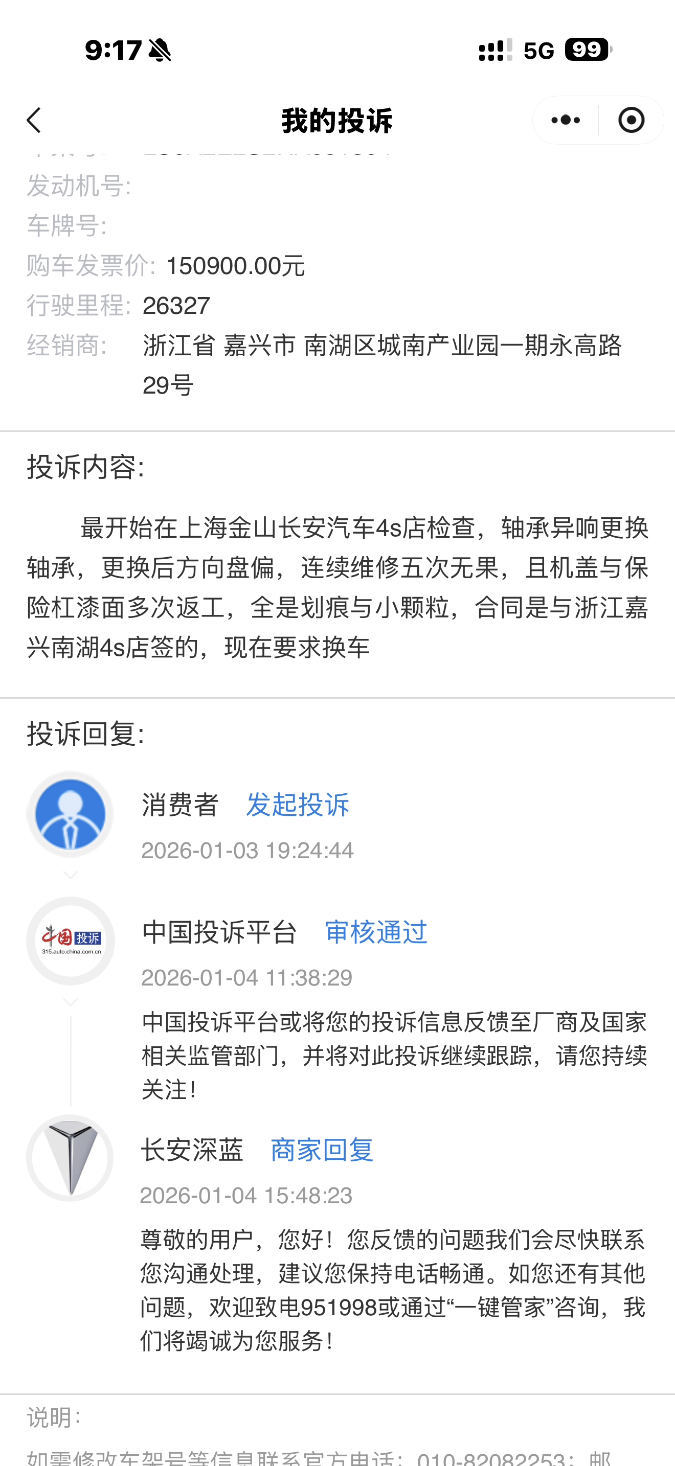 11月份有过事故,在长安汽车上海金山亭卫公路更换保险杠和机盖重新喷漆,但是存在大量划痕及小颗粒,后面12.2号检测出来前左轴承异响,免费给更换前轮轴承,左右各一个,换完之后就出现了其它问题,左右轮子过减速带像崴了脚一样,两次维修才修好(螺丝没拧紧,导致轮子能上下晃动,连带减震)