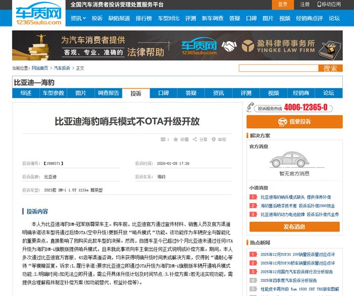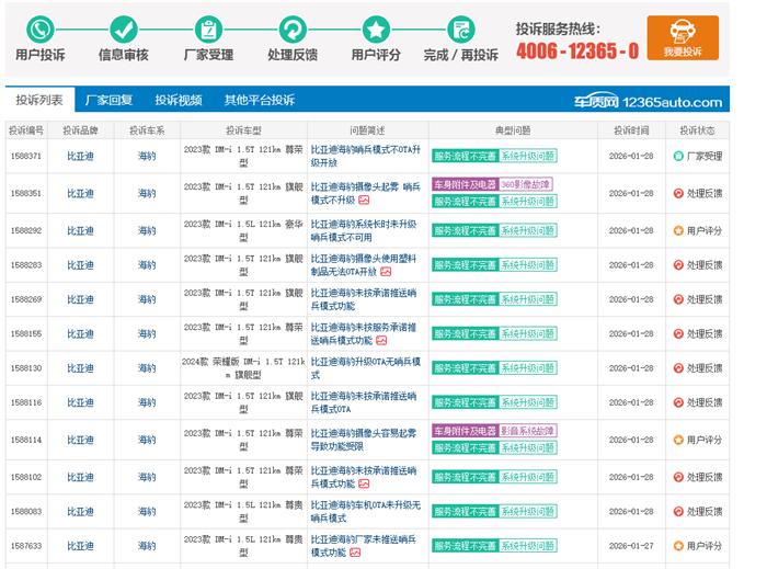 比亚迪海豹哨兵模式不OTA升级开放,本人为比亚迪海豹DM-冠军版尊荣车主。购车前,比亚迪官方通过宣传材料、销售人员及官方渠道明确承诺该车型将通过后续OTA(空中升级)更新开放“哨兵模式“功能。该功能作为车辆安全与智能化的重要卖点,直接影响了我购买此款车型的决策。然而,自提车至今已超过6个月比亚迪未通过任何OTA升级为海豹DM-i旗舰版提供哨兵模式,且未就此事项向车主做出任何正式说明或补偿方案。期间,本人多次通过比亚迪官方客服、4S店等渠道咨询,均未获得明确升级时间表或解决方案,仅得到“请耐心等待“等模糊答复。同样的问题车质网上已经有不少车友反馈,诉求:1.履行承诺:要求比亚迪立即通过OTA升级为海豹DM-i旗舰版车辆开通哨兵模式功能;2.明确时间:如无法立即开通,需公开具体升级计划及时间节点;3.补偿方案:若无法实现功能,需提供合理解释并制定补偿方案(如功能替代、权益补偿等)。